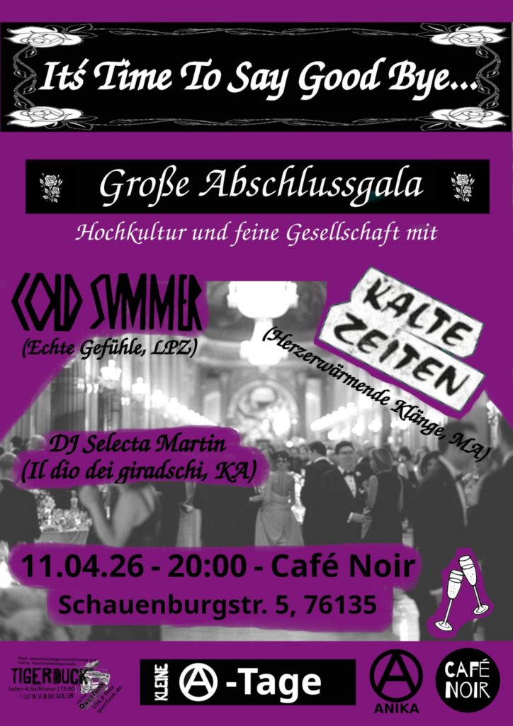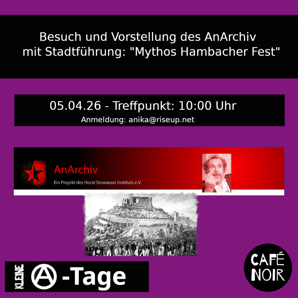 Am 1. Mai ab 11:30 Uhr werden wir als anarchistisches Netzwerk eine Kundgebung auf dem Karlsruher Schloßplatz durchführen. Als Schwerpunkte werden wir die Themen Arbeitsrecht, vor allem unter den aktuellen Bedingungen, sowie gegenseitige Hilfe aufgreifen. Solidarität muss Praxis werden Wir möchten dem kapitalistischen Konkurrenzprinzip eine solidarische Gesellschaftsidee entgegen setzen. Um dies nicht nur theoretisch in […]